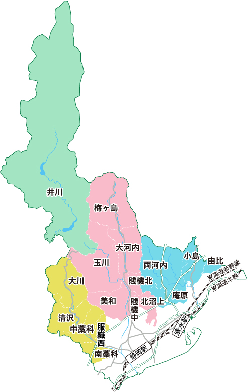 井川、梅ケ島、大河内、玉川、賎機北、賎機中、美和、北沼上、両河内、庵原、小島、由比、大川、清沢、中藁科、服織西、南藁科
